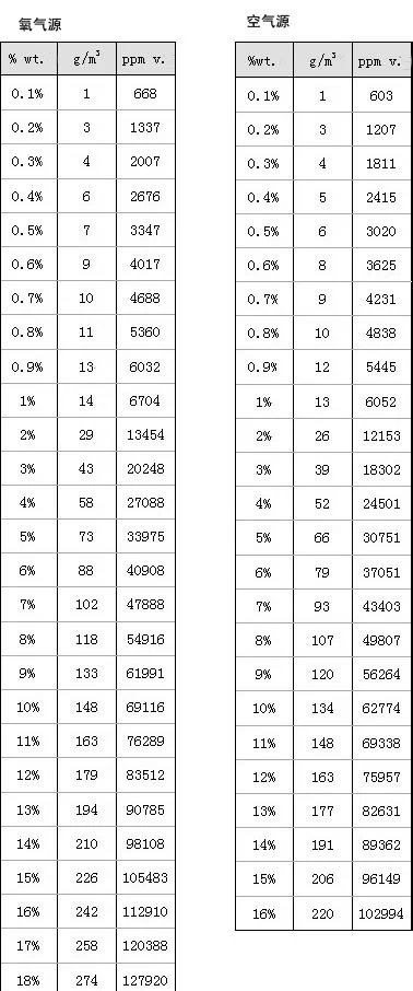 經(jīng)常使用的臭氧濃度單位包括重量百分比濃度wt%,和質(zhì)量體積百分比濃度mg/l(g/m3), 當(dāng)臭氧濃度較低時(shí),如空氣中的臭氧濃度,也會(huì)使用體積百萬分之一ppm v.,由于臭氧濃度單位數(shù)量較多,使用時(shí)經(jīng)常會(huì)有混淆的現(xiàn)象, 下表列出了氧氣源和空氣源的臭氧濃度轉(zhuǎn)換表供參考。